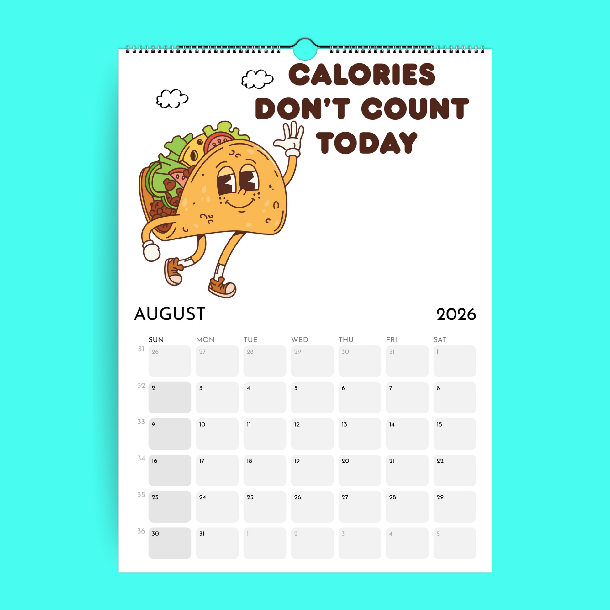 Ce calendrier mural pour 2026 a été imaginé comme un compagnon fun, gourmand et sans culpabilité pour toute l’année. Chaque mois met en scène une illustration de fast food pleine d’humour et de couleurs (burgers, pizza, tacos, nouilles…), accompagnée d’une phrase marrante pour célébrer le plaisir, la gourmandise et la bonne humeur au quotidien.